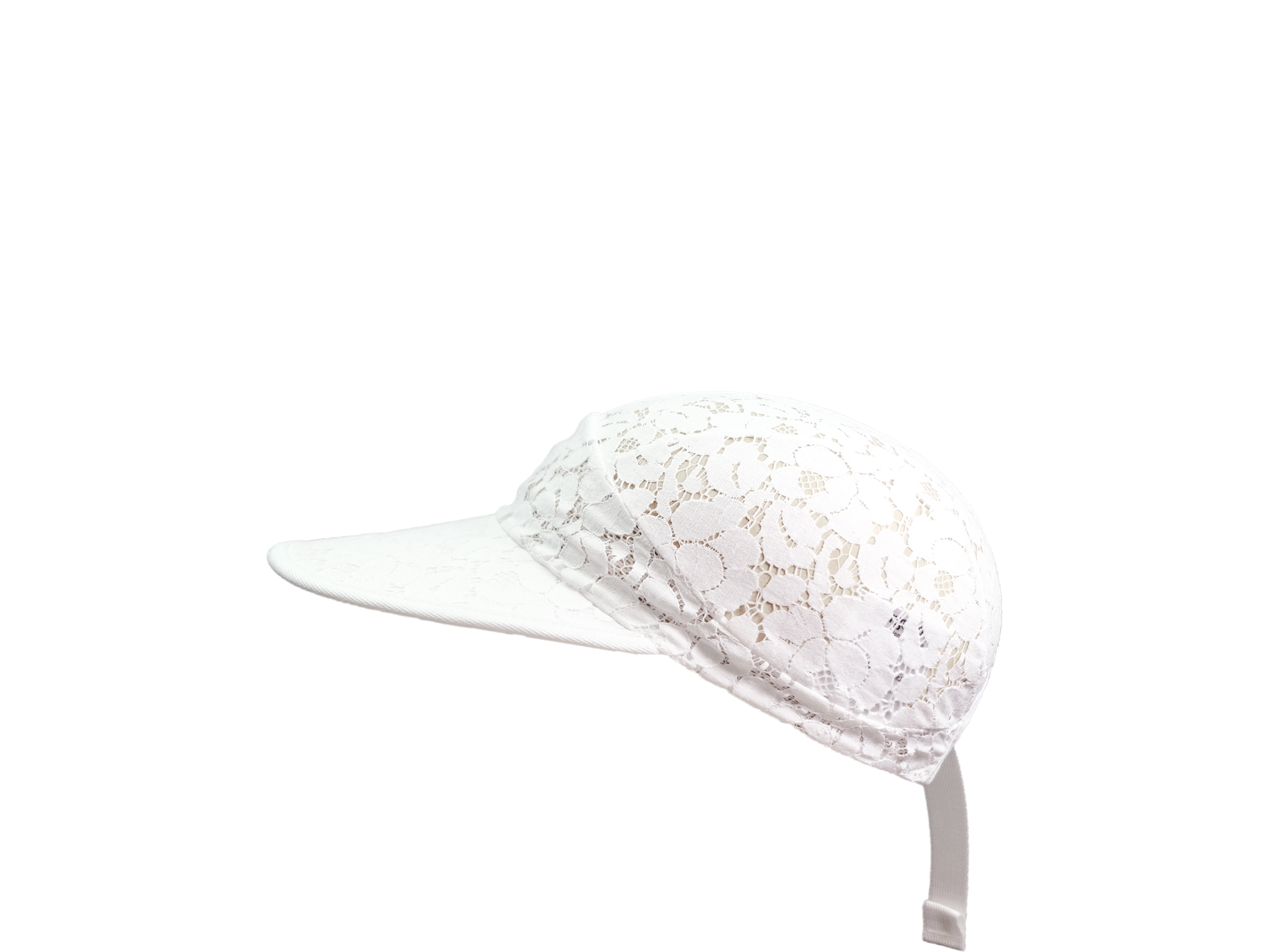 Description: Five panel cap made of lace fabric with logo print. The cap has a big shield for best protection of sunlight. It comes with a strap at the back for size adjustment. For best comfort there is a soft mesh lining inside.